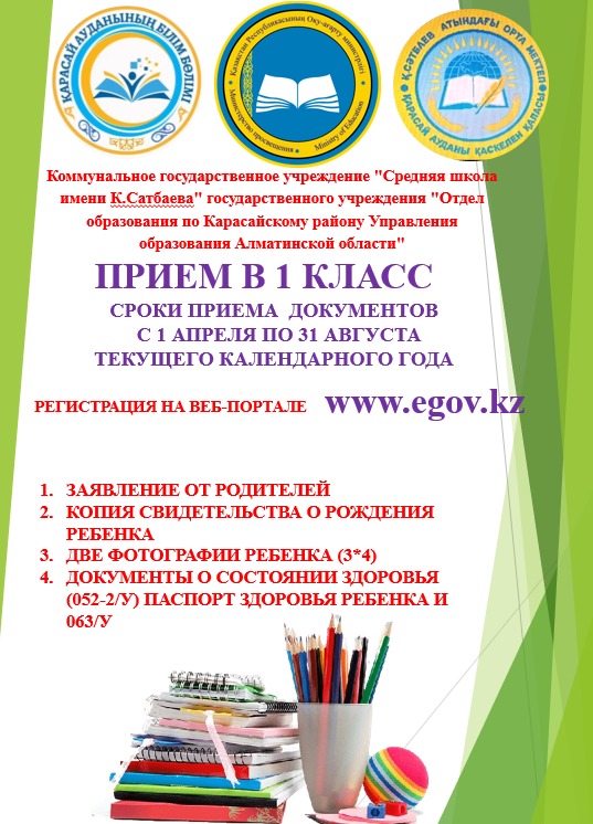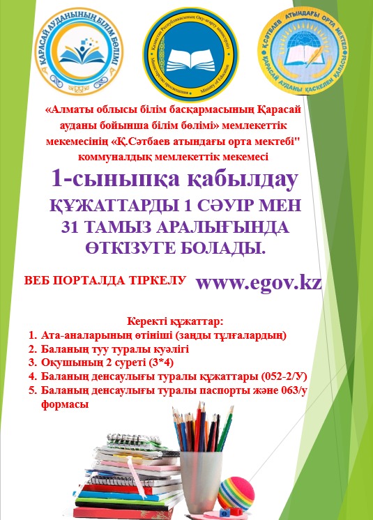 2025-2026 оқу жылы 1-сыныпқа қабылдау » "Алматы облысы білім басқармасының Қарасай ауданы бойынша білім бөлімі" мемлекеттік мекемесінің "Қ.Сәтбаев атындағы орта мектебі" коммуналдық мемлекеттік мекемесі