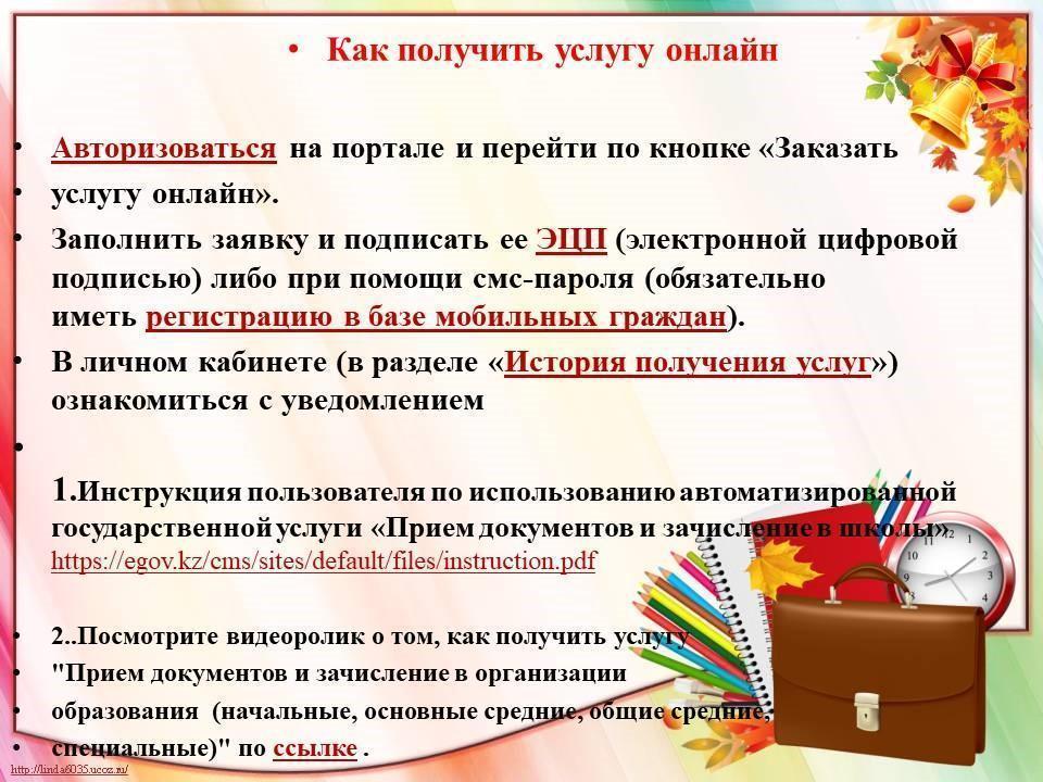 Инструкция пользователя по использованию автоматизированной государственной услуги «Прием документов и зачисление в школы»https://egov.kz/cms/sites/default/files/instruction.pdf
