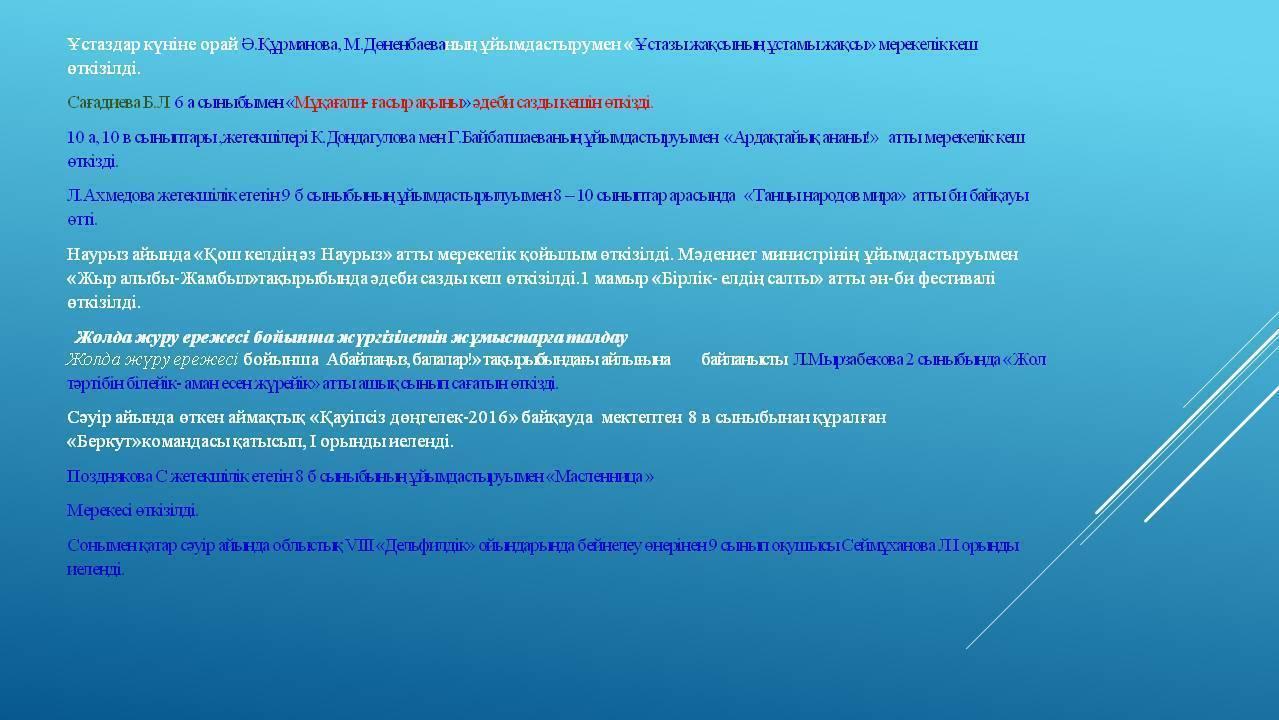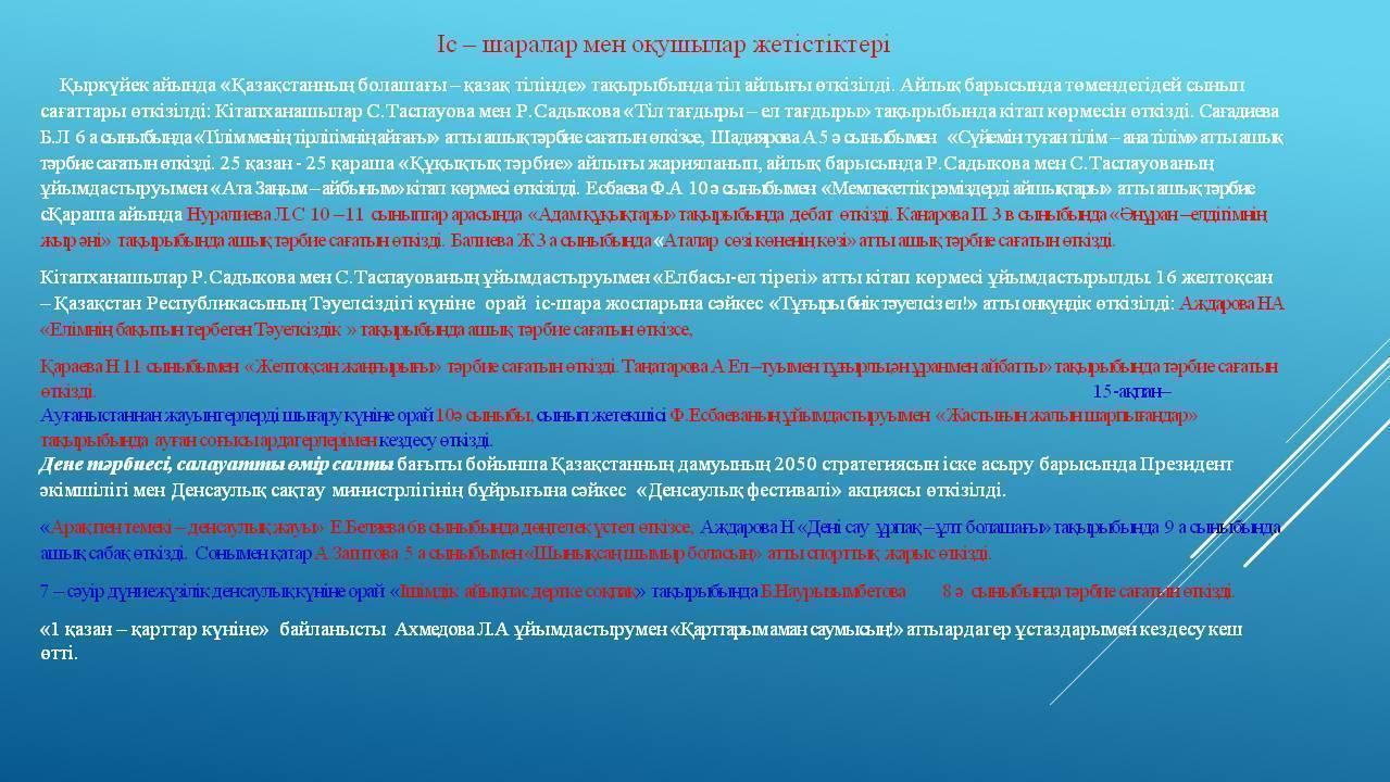 Мерекелік іс-шаралар » "Алматы облысы білім басқармасының Қарасай ауданы бойынша білім бөлімі" мемлекеттік мекемесінің "Қ.Сәтбаев атындағы орта мектебі" коммуналдық мемлекеттік мекемесі