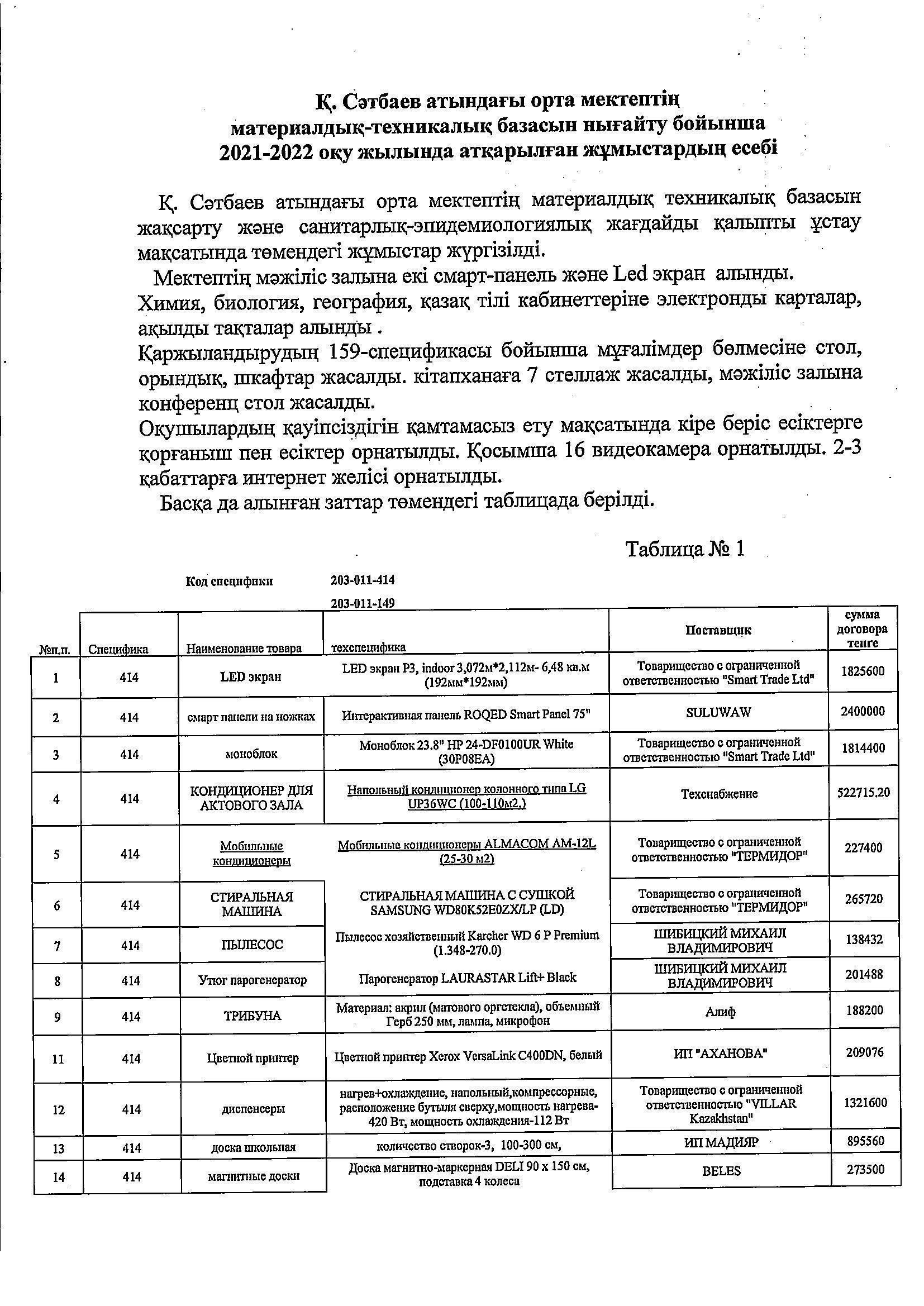 Қамқоршылық кеңес алдында Қ.Сәтбаев атындағы орта мектептің материалдық-техникалық базасын нығайту бойынша 2021-2022 оқу жылында атқарылған жұмыстардың есебі » "Алматы облысы білім басқармасының Қарасай ауданы бойынша білім бөлімі" мемлекеттік мекемесінің "Қ.Сәтбаев атындағы орта мектебі" коммуналдық мемлекеттік мекемесі