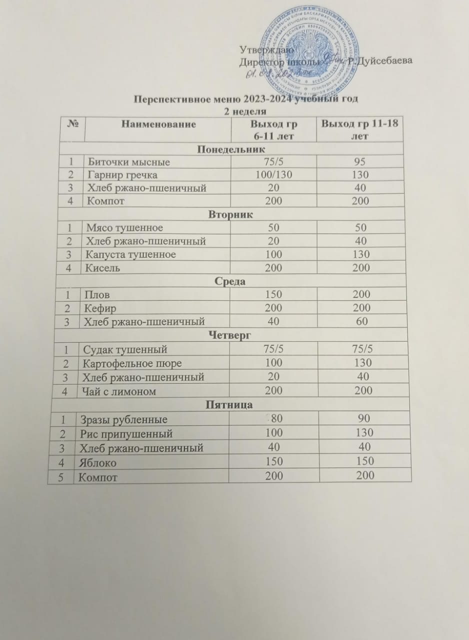 Ас мәзірі / 2 апта/ Перспективное меню / 2 неделя / 2023-2024 оқу жылы