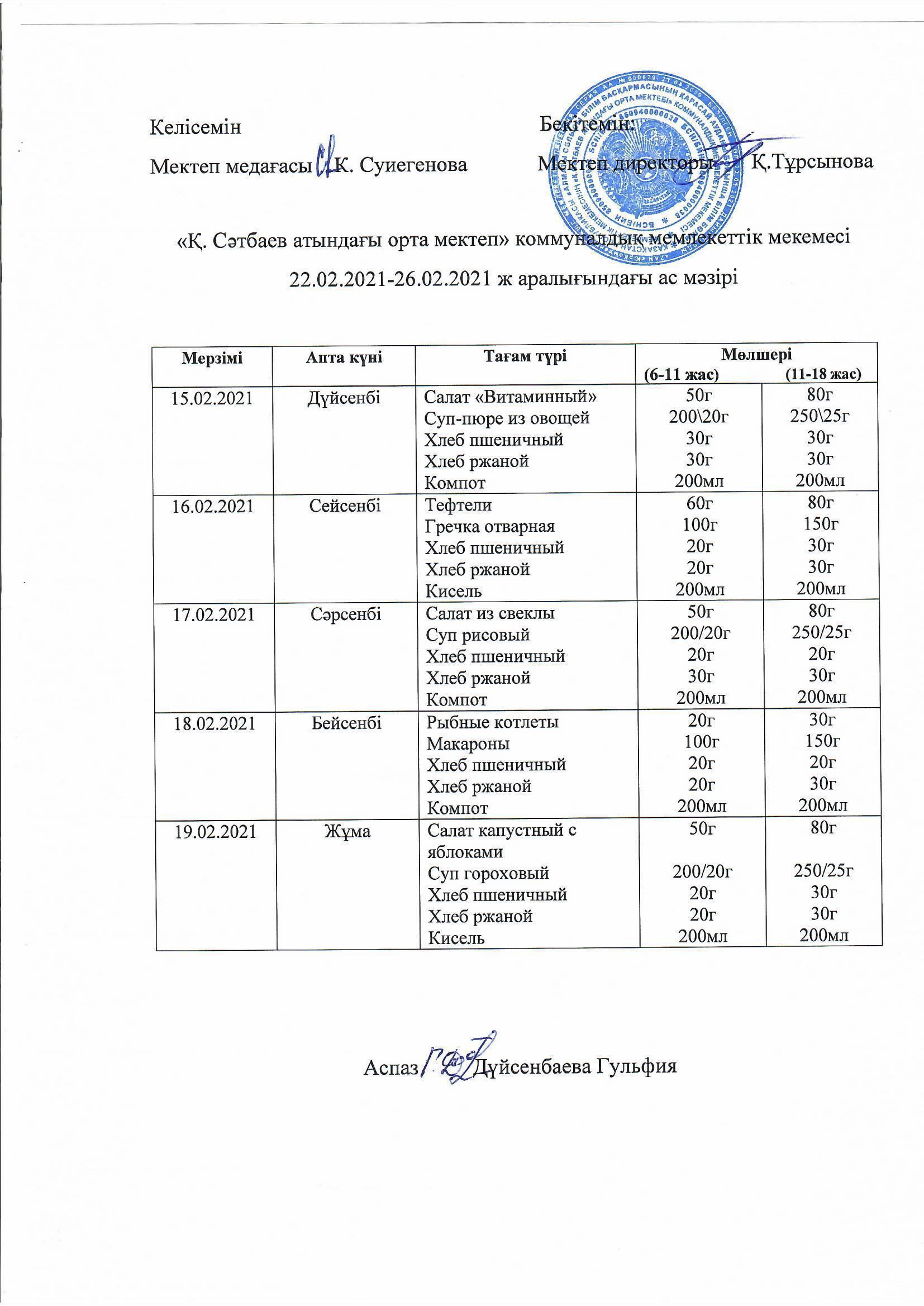 меню на 22.02.2021-26.02.2021 » "Алматы облысы білім басқармасының Қарасай ауданы бойынша білім бөлімі" мемлекеттік мекемесінің "Қ.Сәтбаев атындағы орта мектебі" коммуналдық мемлекеттік мекемесі