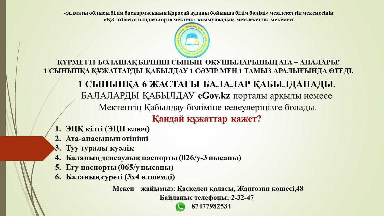1 сыныпқа қабылдау 1 - сәуір күнінен басталды! » "Алматы облысы білім басқармасының Қарасай ауданы бойынша білім бөлімі" мемлекеттік мекемесінің "Қ.Сәтбаев атындағы орта мектебі" коммуналдық мемлекеттік мекемесі