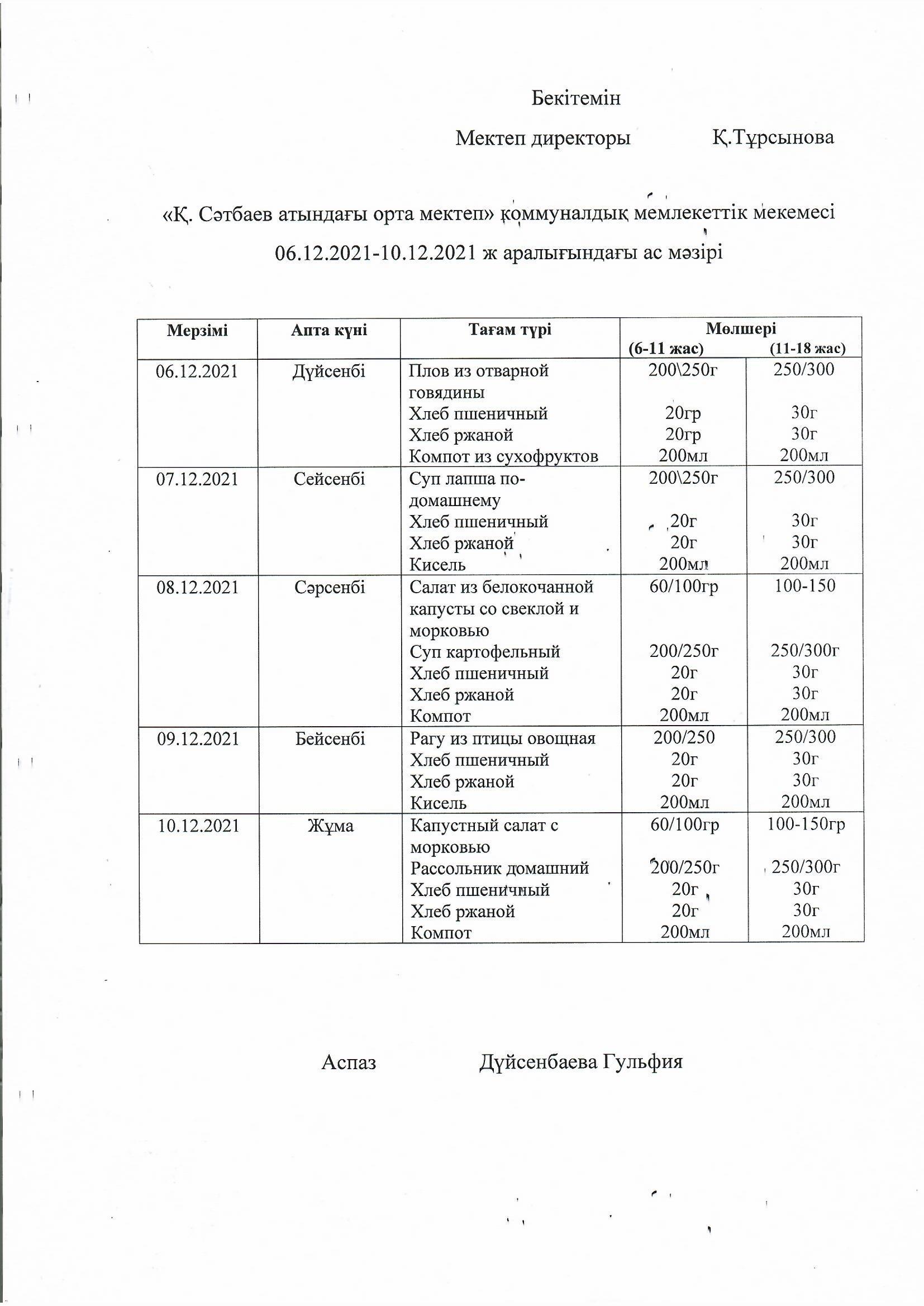 меню на 06.12.2021-10.12.2021 » "Коммунальное государственное учреждение Қарасай ауданы бойынша білім бөлімі" мемлекеттік мекемесінің "Қ.Сәтбаев атындағы орта мектебі" Управления образования Алматинской области